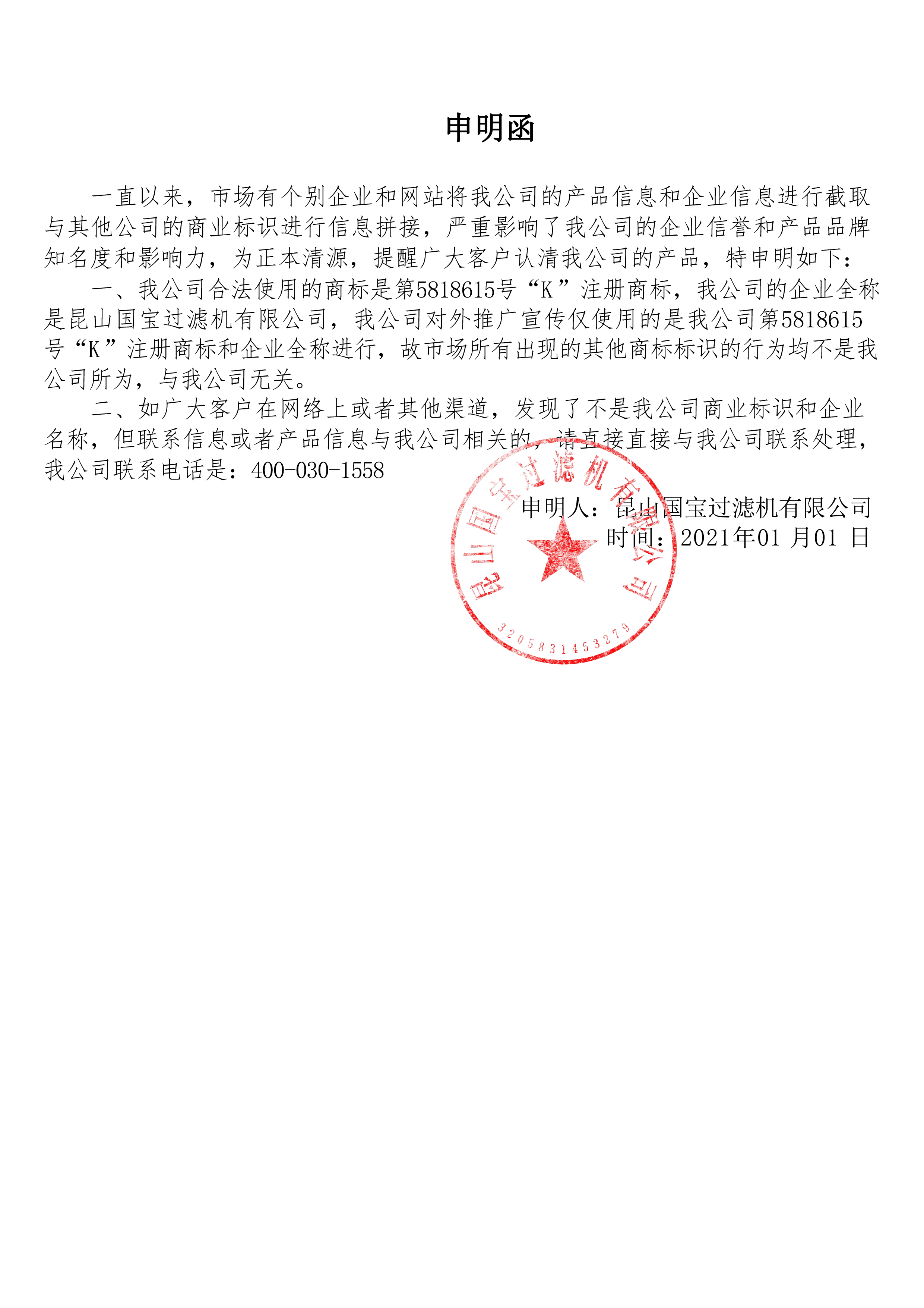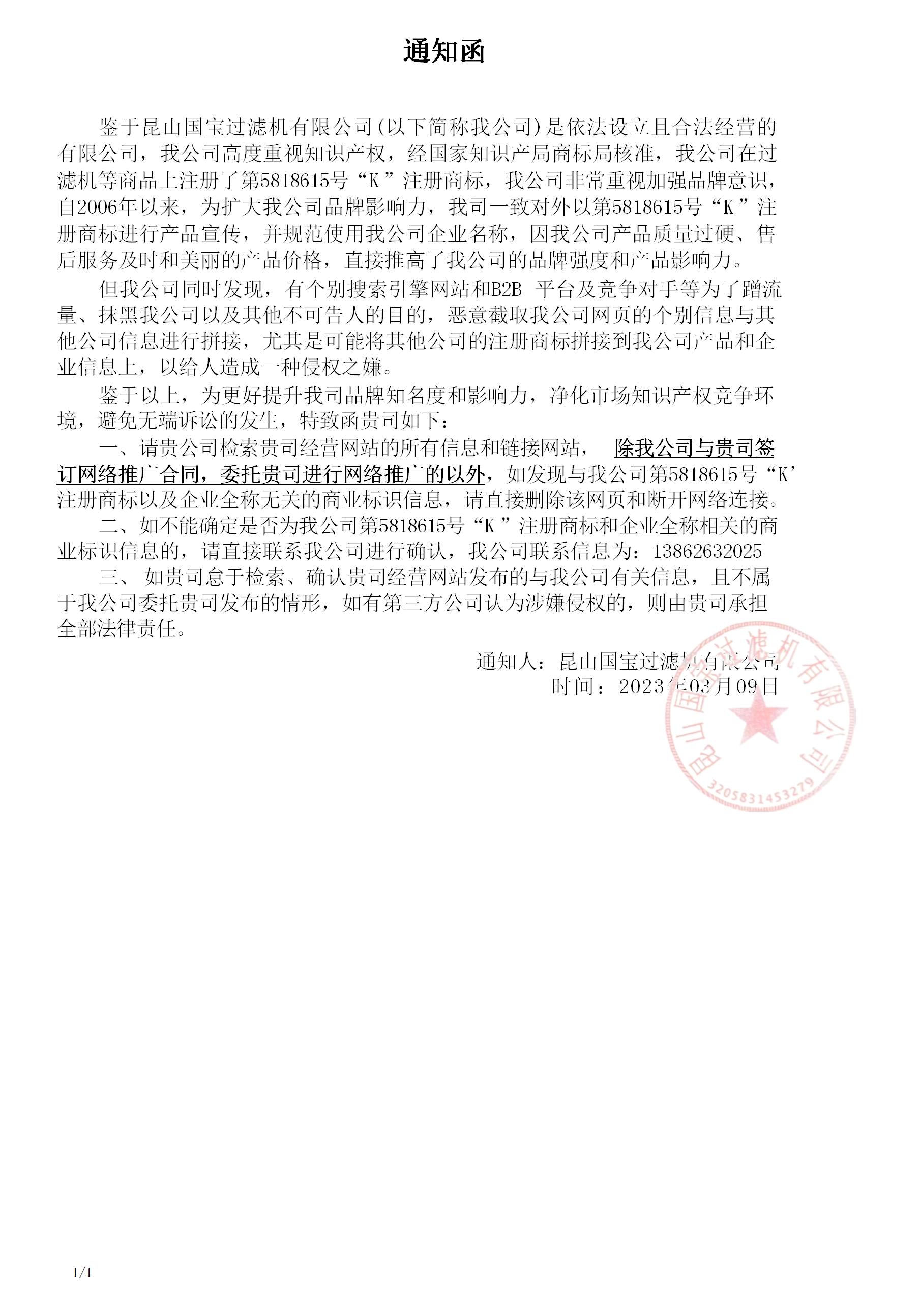 一、我公司合法使用的商標(biāo)是第5818615號(hào)“K”注冊(cè)商標(biāo),我公司的企業(yè)全稱(chēng)是昆山國(guó)寶過(guò)濾機(jī)有限公司,我公司對(duì)外推廣宣傳僅使用的是我公司第5818615號(hào)“K”注冊(cè)商標(biāo)和企業(yè)全稱(chēng)進(jìn)行,故市場(chǎng)所有出現(xiàn)的其他商標(biāo)標(biāo)識(shí)的行為均不是我公司所為,與我公司無(wú)關(guān)。